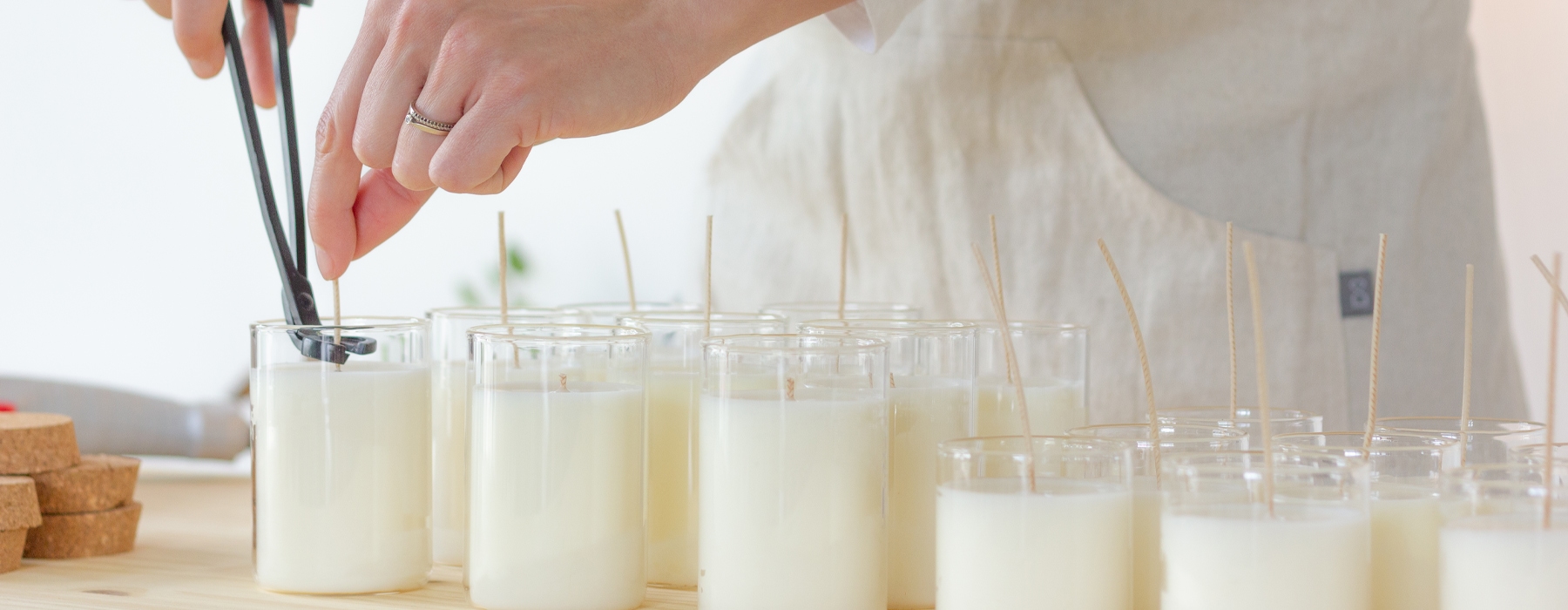Vegetable wax, cotton or wood wick. All our products are respectful of nature and not tested on animals.