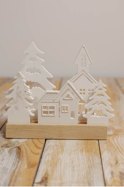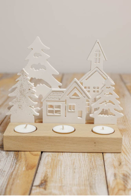 Bring a touch of magic to your Christmas decorations with our Christmas tealight holder, a real little handcrafted gem. Made entirely by hand in our workshop, this tealight holder is made up of a natural oak base and a gypsum decoration encrusted with golden glitter, creating a most charming luminous and festive effect. Its unique design, representing small houses and fir trees, fits perfectly into the spirit of our "Christmas in Lapland" collection, evoking the warm and magical atmosphere of the snowy landscapes of the far North.
